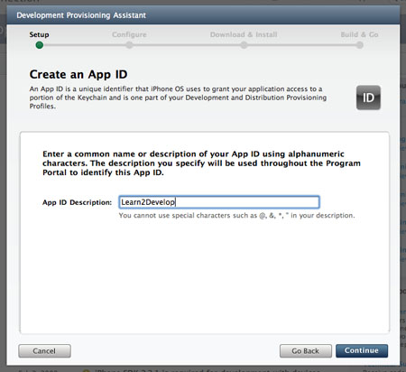 First, you will be asked to create an App ID (see Figure 10). An App ID is a series of characters used to uniquely identify an application (or applications) on your iPhone. You only need to create an App ID once per application, i.e. you do not need a new App ID for new versions of your app. Enter a friendly name to describe this App ID (to be generated by Apple). Click Continue.