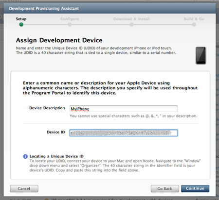 The next screen allows you to provide a description of your iPhone/iPod Touch. You need to provide the device ID that you have obtained earlier (see Figure 11). Click Continue.
