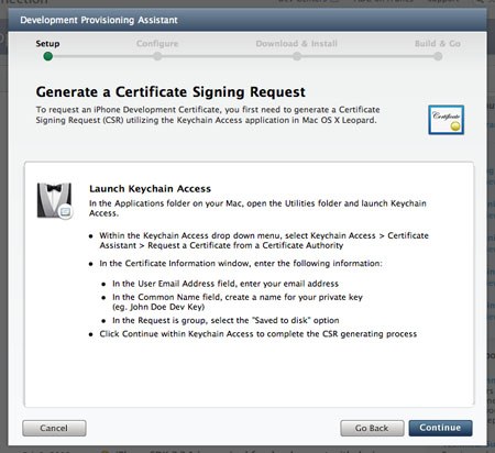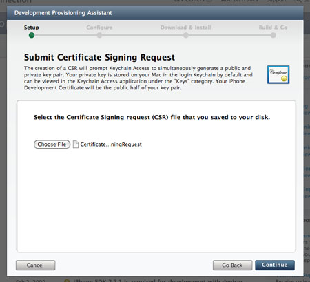 You are now ready to submit the certificate signing request to Apple (see Figure 12). The instructions on the screen show you the steps that you have performed earlier. Click Continue.