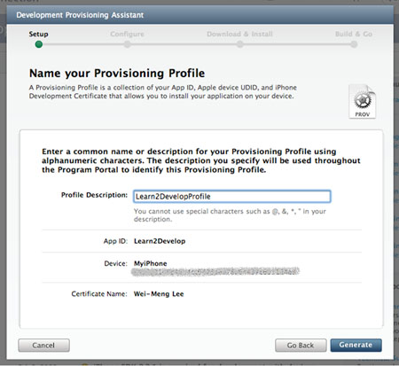 Provide a description for your provisioning profile (see Figure 14). A Provisioning profile will be generated so that you can download it at a later stage and install it on your device. Click Generate.