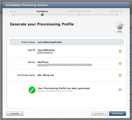 A Provisioning profile will now be generated (see Figure 15). Once it is generated, click Continue.