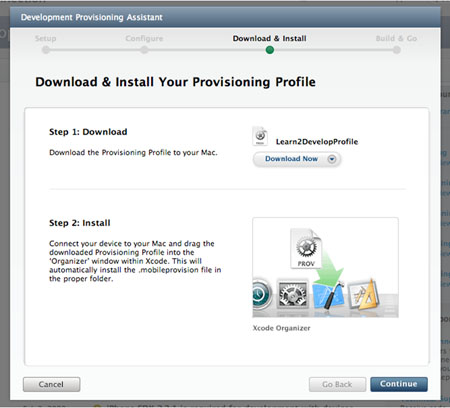 You are now ready to download the generated Provisioning profile onto your Mac (see Figure 16). Click Continue.