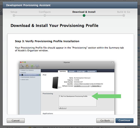 Drag and drop the downloaded Provisioning profile (in the Downloads folder) onto Xcode (located in the Dock). This will install the Provisioning profile onto your connected iPhone/iPod Touch. Click Continue (see Figure 17).