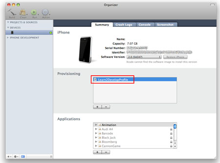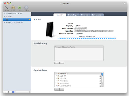 First, obtain the 40-character identifier that uniquely identitfies your iPhone/iPod Touch. To do so, connect your device to your Mac and start Xcode. Select the Window > Organizer menu item to launch the Organizer application. Figure 1 shows the Organizer application showing the identifier of my iPhone. Copy this identifier and save it somewhere. You will need it later on.