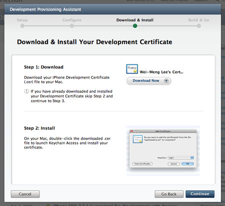 Back in the iPhone Developer Program Portal, you are now ready to download and install the development certificate onto your iPhone/iPod Touch. Click the Download Now button (see Figure 19) to download the development certificate to your Mac. Click Continue.