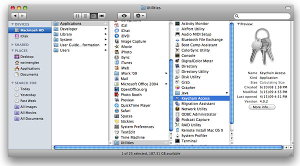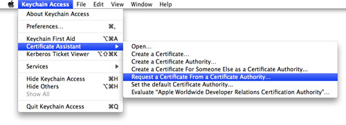 Before you can request a development certificate from Apple, you need to generate a Certificate Signing Request. This step must be performed once for every device you wish to test on. To generate the request, you can use the Keychain Access application located in the Applications/Utilities/ folder (see Figure 2).