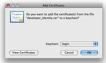 In the Downloads folder of your Mac, double-click on the developer_identify.cer file that you have just downloaded to install it into a keychain on your Mac. When prompted (see Figure 20), click OK.