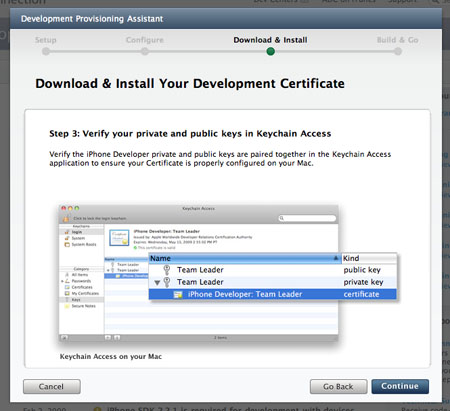 Back in the iPhone Developer Program Portal, you can now verify that the certificate has been installed properly in the Keychain Access application (see Figure 21). Click Continue.