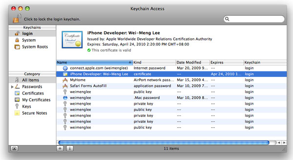 In the Keychain Access application, select the login keychain and look for the certificate named “iPhone Developer:<your name>” (see Figure 22). If you can see it there, your certificate is installed correctly.