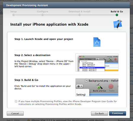 You are now almost ready to deploy your iPhone application onto your iPhone/iPod Touch. Click Continue (see Figure 23).