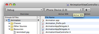 In Xcode, under the Active SDK item (if this item is not already on the toolbar, go to View > Customize Toolbar and add it to the toolbar), select the OS version number of the device that is currently connected to your Mac. In my case, my iPhone is running the older iPhone OS 2.0, hence I selected “iPhone Device (2.0)” (see Figure 25).
