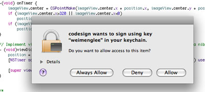 With your application project open in Xcode, press Command-R to run the application. You will now be prompted for permission to access the certificate saved in your keychain. Click Allow (or Always Allow) to go ahead with the signing (see Figure 26).