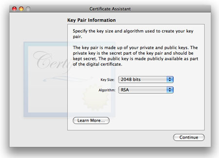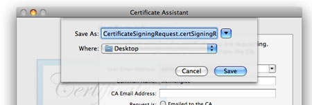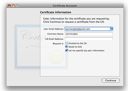 In the Certificate Assistant window (see Figure 4), enter your email address, check the Saved to disk radio button and check the Let me specify key pair information checkbox. Click Continue.
