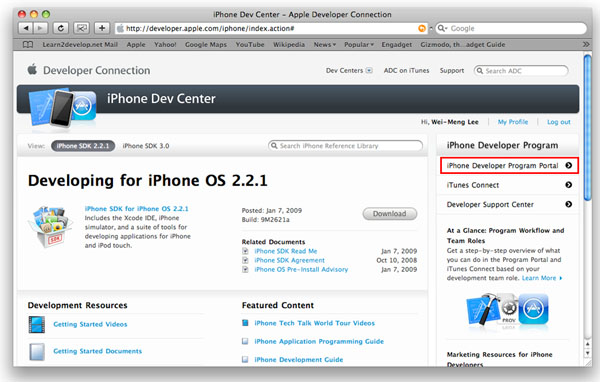 Once you have generated the certificate signing request, you need to login to Apple’s iPhone Dev Center (see Figure 7). Click on the iPhone Developer Program Portal link on the right of the page. Remember, you need to pay US$99 in order to access this page.