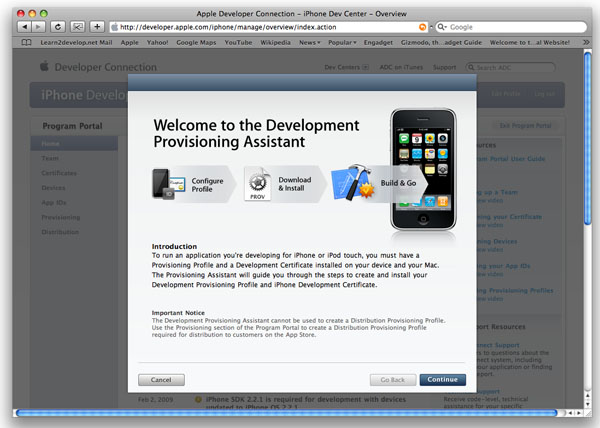 In the iPhone Developer Program Portal page, click the Launch Assistant button (see Figure 8) to walk you through the process of provisioning your iPhone and generating the development certificate.