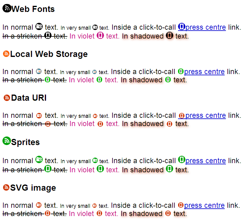 whereas fonts provide flat, black and white glyphs, to be livened up with CSS.