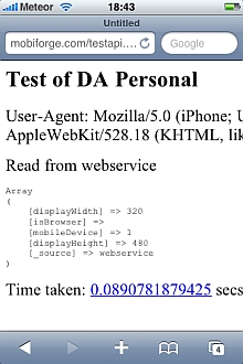 The results of viewing this page on a mobile device (an iPhone, zoomed, in this case) is shown to the right. The properties returned from the DeviceAtlas database are: