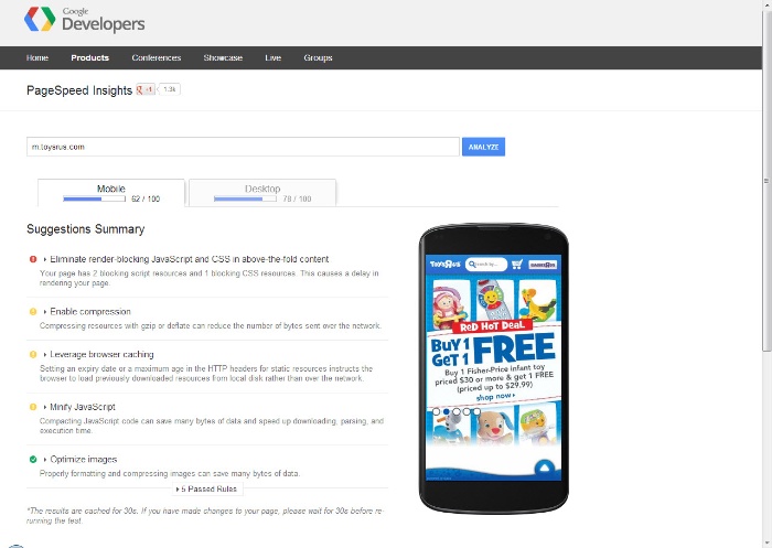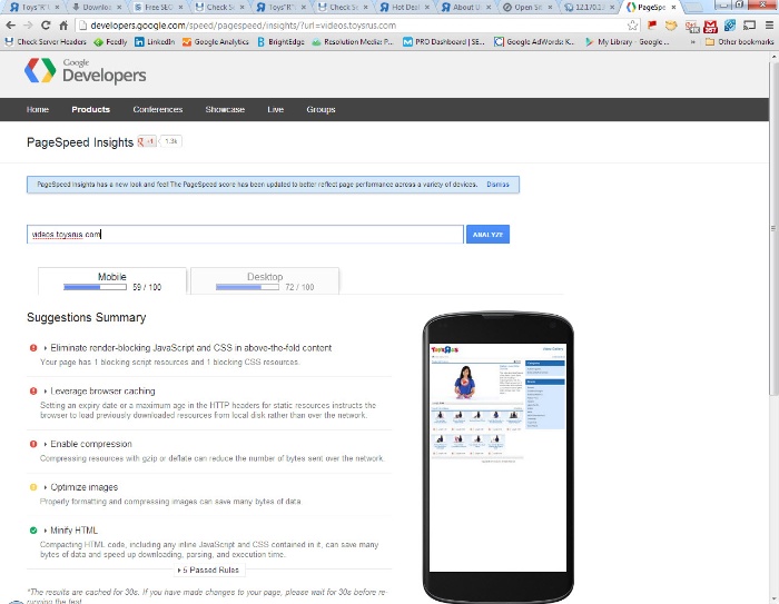 When we use the page speed tool for m.toysrus.com and video.toysrus.com we can see that there’s room for improvement.