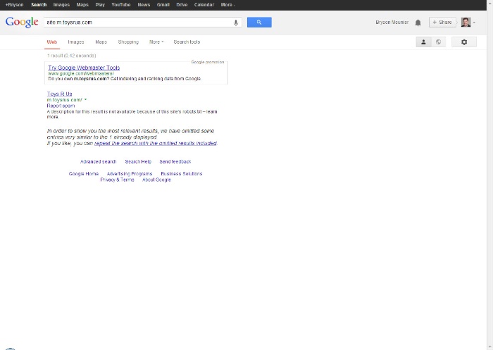 Recommendation: Toys “R” Us should immediately allow Google and other legitimate robots to access and follow their mobile site so that the appropriate content can be returned for the appropriate searcher.