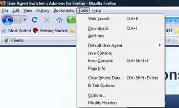 After the add-ons have been installed, Firefox is ready to use for mobile site testing. Check out the Tools menu and you should see Default User Agent and Modify Headers.