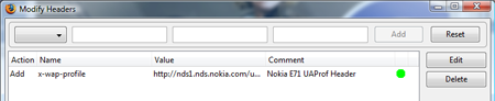 Now, we need to add a x-wap-profile HTTP Header. Most intelligent mobile Web sites look for this header to identify a mobile device. To my knowledge, only the iPhone doesn’t pass this HTTP Header. You can search around the Web to find UA Profile URLs (type “UAProf URL List” into a search engine). A good resource is Motorola’s repository.