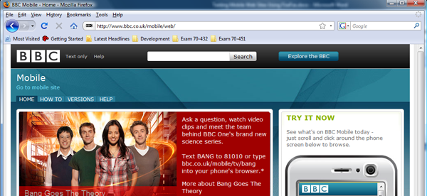 Close the Modify Headers dialog and return to the BBC Web site you had open earlier. Press F5. Hey presto! You are redirected to the BBC’s mobile site information page. This is actually a desktop page that allows you to go to the mobile version of the BBC Web site.