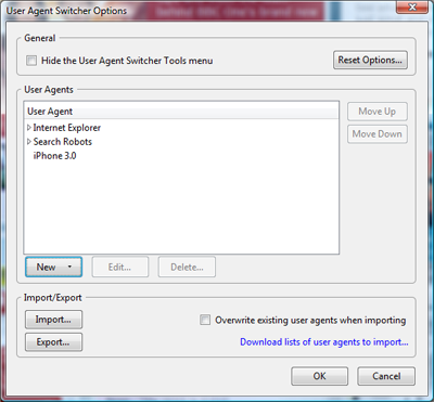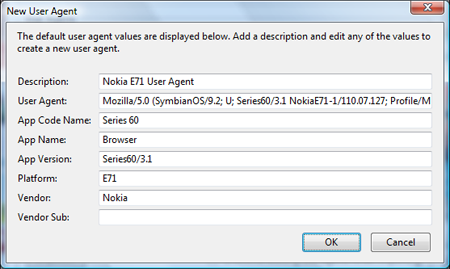Click the New button, and choose New User Agent from the drop-down list. Fill in the boxes as required – you only really need to worry about the first two (copy and paste the user agent for the E71 above if you haven’t a user agent of your own). Click OK to save the user agent, and click OK again to return to Firefox.