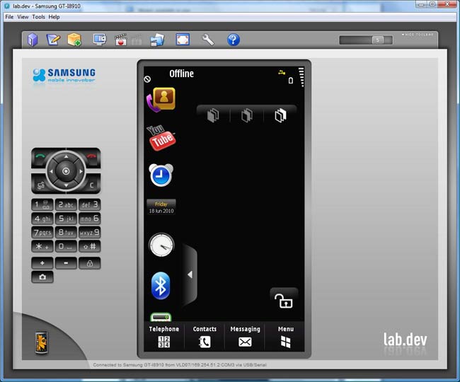 Clicking on the device initiates a Java download (the system uses a Java engine). Accept the download and content from Samsung, and the environment will appear displaying the device: