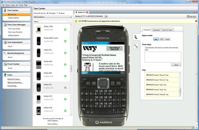 Unlike Samsung Lab.Dev, DeviceAnywhere is a paid-for solution. DeviceAnywhere offers a software package that cleverly allows you to use real devices over the Internet. The devices are connected to the Internet and can be used to make phone calls, send text messages, browse the Internet and download applications. As you are using the actual physical device, you can be confident that what happens when you use the device through DeviceAnywhere is what will happen when a user uses your service on that device.