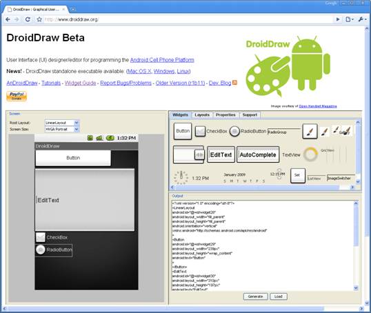 Eclipse provides only minimal support for designing Android UI and so you won’t be able to drag-and-drop of widgets on a design surface. Instead, you can use the free DroidDraw tool available at http://www.droiddraw.org/. Figure 2 shows the DroidDraw in action. You can drag-and-drop widgets onto different layouts and then use it to generate its equivalent XML code. While DroidDraw is not perfect, it is very useful to get you started with Android UI design and is a good tool to learn the various Views and ViewGroups in Android.