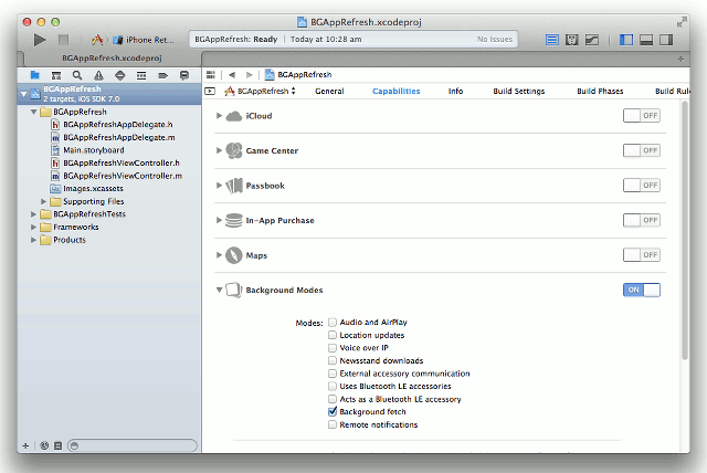 Once the project is created, select the project name and click on the Capabilities tab on the right (see Figure 2). Turn on the Background Modes capability and expand it. Check the Background fetch item.