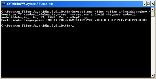 keytool.exe -list -alias androiddebugkey -keystore "C:androiddebug.keystore" -storepass android -keypass android