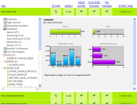 On the landing page, you can now choose between single Page testing (the old ready.mobi) and Site testing. Page testing performs mobileOK basic tests and dotMobi compliance tests and scores your page between 1 and 5. Its the new Site testing feature that we're excited about – this feature looks for pages in your site, and scores each page automatically.