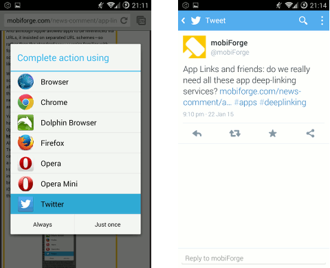 You can see this approach in action right now if you have the Twitter app installed on your Android device. Open up your browser and click on this link: https://twitter.com/mobiForge/status/558355939989143553. Although this is a web link, it can be opened in the Twitter app, so the user is given a choice of apps that can open it: browsers and Twitter in this case. So it’s a deep link into an Android app, using a regular http:// URL. If you don’t have the Twitter app installed it will simply be opened up in the web browser on your device. Try the same thing on your iOS device, with Twitter installed, and you’ll still have that link opened up in a browser.