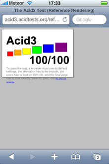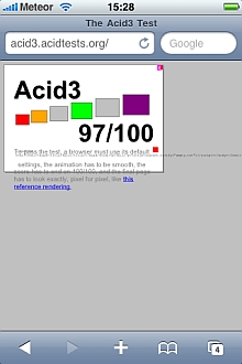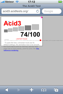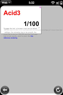 In the ACID2 test the iPhone produced an imperfect image, while the Pre did not produce any image at all. In the ACID3 test, the iPhone again appeared to do better, as the Pre seemed to get stuck in a reload loop, and the best screen grab we could get is included below.