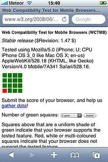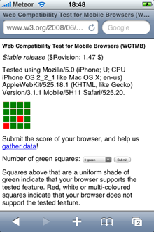 UPDATE (26th June 2009): We’ve run the new iPhone firmware through the WCTMB and ACID3 tests. In the WCTMB test this version of Mobile Safari additionally passes the Dynamic SVG test. Results are also better for ACID3 tests (see images below)