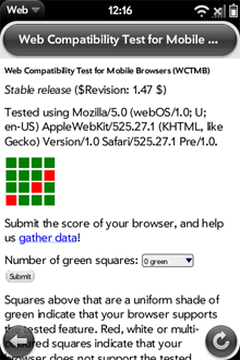 Since these are mobile browsers, we also ran them through the W3C Web Compatibility Test for Mobile Browsers (WCTMB). Again, mobile Safari browser performed better than the Pre, though not by much. They both failed on the Dynamic SVG, and DOM mutation events, and additionally the Pre failed on the Static SVG test.