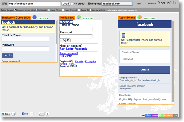 You can see that Facebook uses a similar approach to Google in that it jettisons JavaScript from lower-end devices, but appears to mistakenly send about 75KB of CSS to the poor Nokia 6300, a phone ill-equipped to handle it.