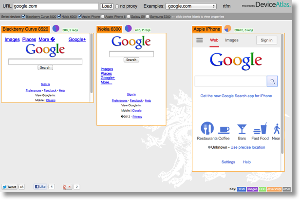 Here in dotMobi we found ourselves repeatedly switching UAs and reloading pages in our testing of our own products. We also found it very difficult to show people how server-side device detection was being used around the web since there was no easy way to show at a glance how a site responds to multiple different devices. So, over the past few months we’ve been building an internal tool to help us with all of these problems and, now that it’s working reasonably well, we thought it would make sense to make it available externally.