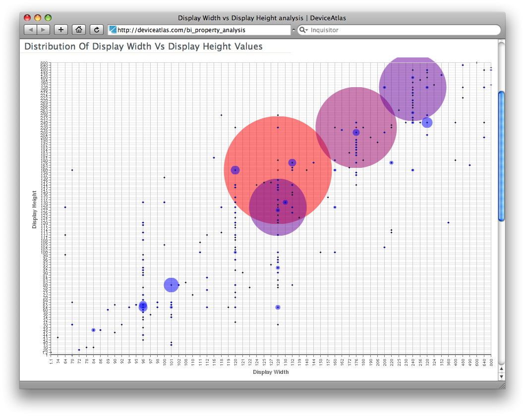 Here, the size – and colour – of the bubbles is dictated by the number of devices sharing those two values. Immediately, it's clear from this that the most common screen size is 128px x 160px (shared by over 850 devices). Hovering over the bubble gives you stats, and clicking drills you down to a list of devices matching those criteria.