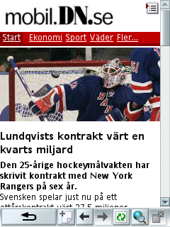 The purpose of Novarra is ok: making desktop web pages readable on the mobile phone. However, pages already optimized for the mobile context are also transcoded. In addition, a navigational bar and an advertising banner are placed at the top of the page. The Novarra is not "default" in the SurfOpen case, though. It is only used when the user types in an url on the Telia Surfport portal: