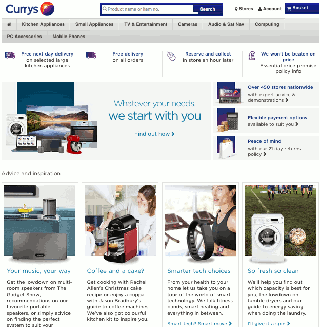 Currys homepage on mobile, above and below the foldThe layout hierarchy of the desktop site persists on mobile, with only one change – the right-hand column that begins with ‘Over 450 stores nationwide’ has been pushed to the bottom of the page on mobile, see below.