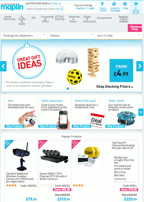 Maplin site on desktop (Google Chrome)Notice the absence of the ‘New’, ‘Home Automation’ etc. box that sits below the top slider on the mobile version (below) – the choice has been made to fill this section solely with ‘Popular Products’. Notice also that the ‘Challenge the Maplineers’, ‘Delivery and ‘Here to Help’ tabs visible on the desktop site have been removed from the top of the homepage on mobile.