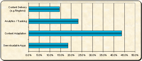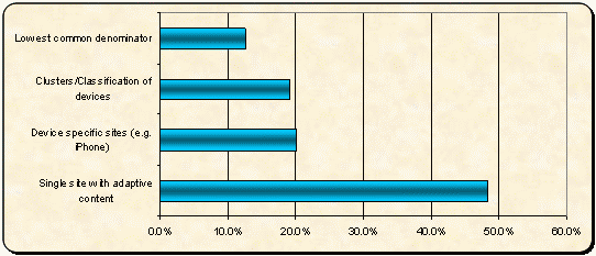 - for delivering ‘adapting’ mobile web sites, the preferred approach is to develop a single site with adapting content (~50%), rather than by targeting versions of a site at specific devices (~20%), or by targeting versions of a site at clusters of devices(~20%)