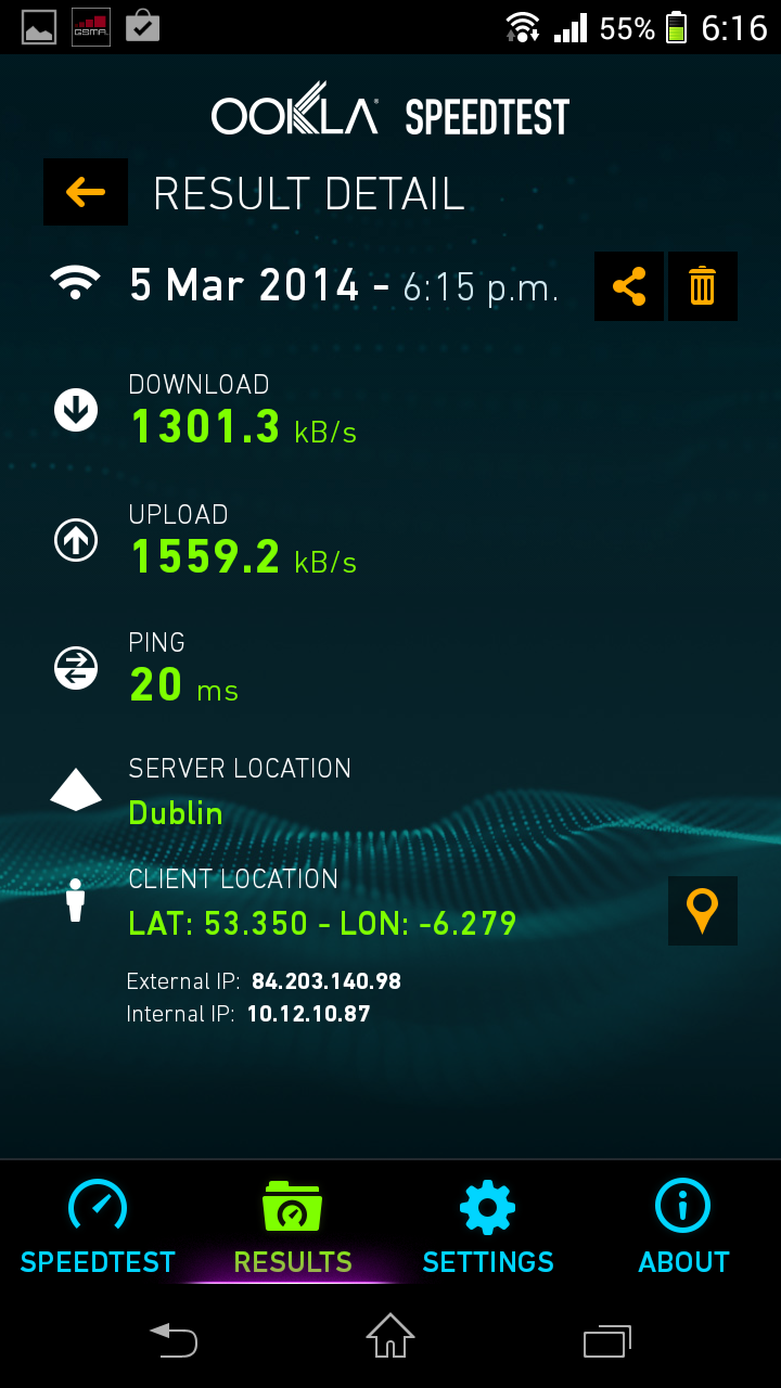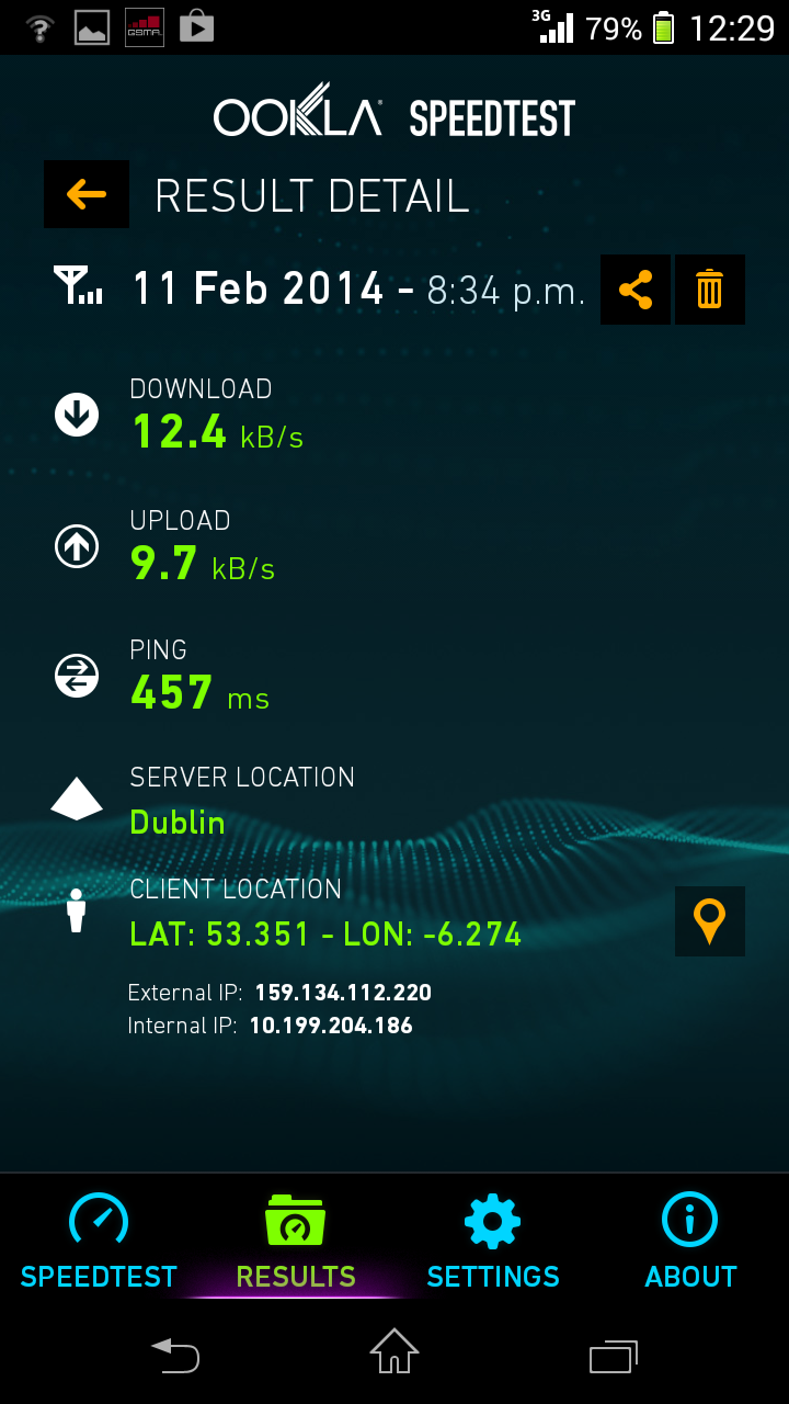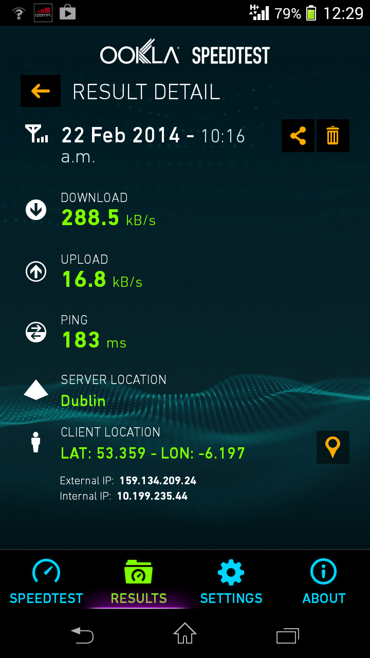 I used Ookla’s speedtest app installed directly onto my device to measure connection speeds for conditions set out above. The device in question is a Sony Xperia T, a mid to high range Android running Jelly Bean (specs here via DeviceAtlas). Here are the results of the speed tests which range from office WiFi on the high end of the spectrum to an EDGE connection in my modest but sensibly built home: