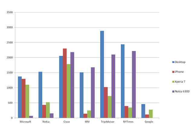 As you can see, there is a wide variance between how the page weight altered between desktop and low end devices. In the case of Microsoft and Nokia, the page weight decreases markedly as you step down screen size. In the case of Microsoft, the low end Nokia feature phone is directed to a specific mdot site as opposed to serving the responsive site to that device. Nokia’s site manages a simple degradation of page weight without resorting to a separate URL. Both companies appear to have a web strategy that spans multiple device classes. However Nokia does a much better job of optimizing page weights for mobile.